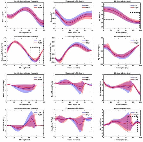 Illustration of the significant difference in the parameters of the dominant and non-dominant lower limbs during pre-fatigue for the over-ground running test. Note: the dotted box indicates a statistically significant difference, p < 0.05. Left: Left lower limb (non-dominant). Right: Right (dominant) lower limb. The solid curve indicates the mean value at each time point. The shaded area indicates the standard deviation at each time point.