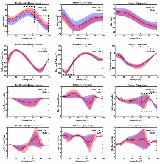 Illustration of the significant difference in the parameters of the dominant and non-dominant lower limbs during post-fatigue for the over-ground running test. Note: the dotted boxes indicate a statistically significant difference, p < 0.05. Left: Left lower limb (non-dominant). Right: Right (dominant) lower limb. The solid curve indicates the mean value at each time point. The shaded area indicates the standard deviation at each time point.