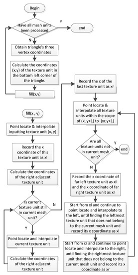 Before we calculate the texture, we point position and interpolate the vertex in the lower left corner of each texture pixel. After all texture pixels are processed in this way, the original irregular grid is transformed into a regular grid that is composed of all texture pixels. Then, in the process of texture generation, the point location and interpolation of each sampling point are no longer conducted according to the original irregular grid unit, but rather are conducted according to the texture pixel, which greatly improves the algorithm’s speed.