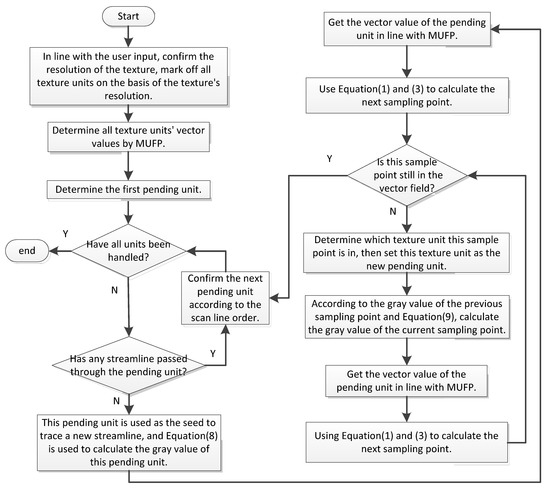 Figure 3 shows the procedure flow chart of the RIS method. The basic processes for RIS and FLIC is similar, with three important improvements. Firstly, the MUFP algorithm is used to complete the localization and interpolation of all texture pixels in advance. Secondly, Equation (8) instead of white noise is used to calculate the pixel values of the seed point of each streamline. Third, Equation (9) is used to calculate the gray value of the follow-up sample points along the streamline. Through these improvements, RIS has a much higher time efficiency than FLIC.
