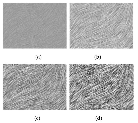 The other advantage of using Equation (11) instead of Equation (8) is that we can easily achieve high contrast without increasing the computation by just adjusting the parameter r. Figure 8a shows the texture that is drawn using Equations (8) and (9), which is very similar to the traditional LIC algorithm. The following three pictures are drawn with Equations (11) and (9), and the parameter r is set to 30, 50, and 90. It can be seen that due to the increasing difference in the gray values of the seed points of different streamlines, the final texture has high contrast.