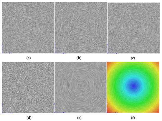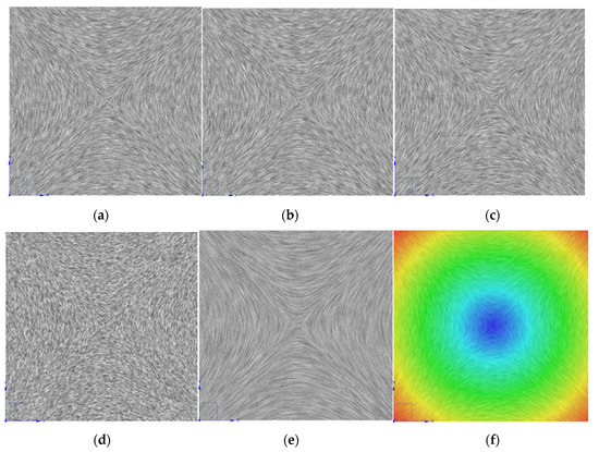 Figure 11 shows a set of textures drawn according to artificial concentric circle vector field data. Figure 11a is drawn using the LIC algorithm, Figure 11b is drawn using the FLIC algorithm, and Figure 11c is drawn using the RIS algorithm. The one-sided convolution length L is the parameter L in Equation (8), which is set to 10. You can see that the appearance of the RIS texture is basically the same as the traditional LIC algorithm. In order to further verify the effect of the RIS algorithm, the parameters for L in Equation (8) are set to 5 and 20, respectively, and Figure 11d,e are obtained. Short texture and long texture effects are achieved. Figure 11f is the RIS texture obtained using Equation (10).