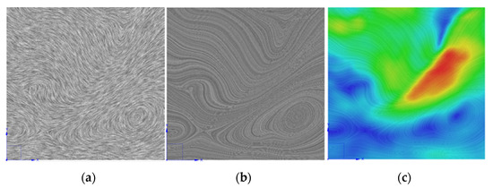 Jobard and Lefer [7] proposed a new data structure called the “motion map”, which can be used to draw clear cyclic animations and display the directional information of a steady vector field. The authors of [8] presented the Enhanced Line Integral Convolution (ELIC) method to increase the texture contrast, in which white noise was convolved twice for the purpose of improving the contrast. At the same time, the time consumption was inevitably increased. Wegenkittl et al. proposed two algorithms, Oriented Line Integral Convolution (OLIC) [16] and Fast Oriented Line Integral Convolution (FOLIC) [17], which use dense short streamlines to simulate the LIC effect. In essence, these two algorithms are no longer texture algorithms, rather they generate “pseudo textures”. The advantage of this method is that the computation amount is lower than that of the LIC algorithm, but the disadvantage is that it cannot provide pixel-level flow field details. Another paper presented an improved LIC algorithm [18] that provides the rules for determining the integration step size and interpolation mode according to the vector speed size and the angle between the two vectors. The Unsteady Flow Line Integral Convolution (UFLIC) algorithm was proposed in [19], which follows the traces to realize the visualization of unsteady flow fields.