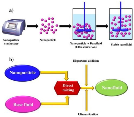 In many industrial fields, heat transfer is not only a technical issue where it is important but also a challenge for engineers and businesspeople. To overcome this challenge, one of the common methods is to increase the available surface area for heat exchange. In thermal management systems, this method leads to undesirable and unrealistic increases in heat transport. Businesspeople and engineers are faced with the poor thermal properties of traditional fluids such as water, alcohol, ethylene glycol, or oil. Therefore, there is an urgent need to improve the thermal conductivity of these fluids to overcome such problems in heat transport []. Nanofluids are the best solution to this problem with the fact that it is a suspension of nanometer-sized metal oxides, metals (Figure 1), polymers, carbon nanotubes or silica particles dispersed in the ordinary fluid []. This idea was proposed in 1995 by Choi []. In recent years, many researchers have studied the effects of nanofluids to improve heat transfer in thermal engineering devices, both experimentally and theoretically. Researchers also applied various preparation methods, properties, and different models used to calculate the thermophysical properties of nanofluids (i.e., thermal conductivity, viscosity, density, specific heat capacity) [,,,,,,,]. Some scientists have also studied the effects of nanoflares on the flow and heat transfer in natural and forced heating in different systems [,,,]. Different schemes and approaches have been reported in the literature for the solutions of mathematical problems regarding nanofluid flow [,,,,,,,].