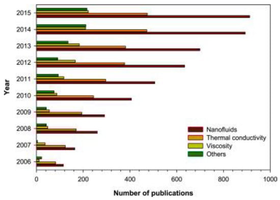 Year-wise publications records on different areas of nanofluids from Web of Science.