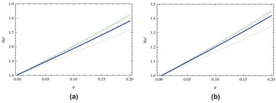 Values of Nusselt number against volume fraction for five different water-based nanofluids; dotted curve for TiO2, the dot-dashed curve for Al2O3, the dashed curve for CuO, the thin curve for Cu, and thick curve for Ag. (a) Nr = 0 and (b) Nr = 1 [].