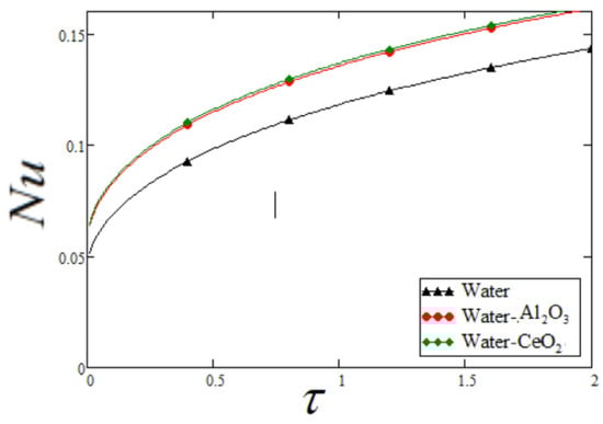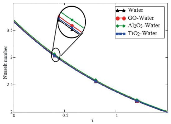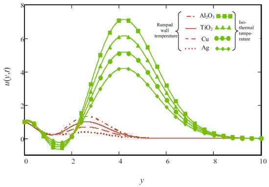 Many researchers have proposed exact solutions for the flow of a nanofluid in different geometries and with different techniques. Integral transforms have been used for such solutions. The flow of nanofluid over a vertical plate with heat and mass transfer is considered by Turkyilmazoglu and Pop [], who obtained the exact solutions by the Laplace transform technique. In their paper [], the radiation effect for two different boundary conditions is considered. Copper, silver, copper oxide, aluminum oxide, and titanium oxides nanoparticles have been considered in this research article. In the concluding remarks of this research paper, it is mentioned that the nanofluid with copper nanoparticles has the highest heat transfer and the nanofluid with titanium oxide has the least one (Figure 4).