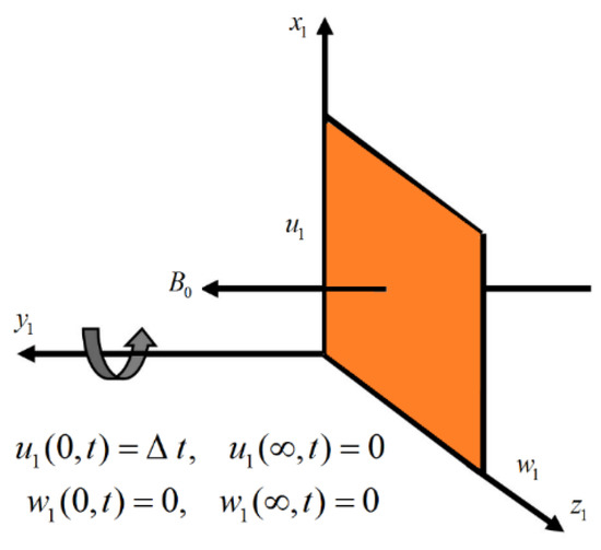Exact solutions are found for the flow of Jeffrey nanofluid embedded in a Darcian porous media with heat transfer by Zin et al. []. They discussed copper and silver nanoparticles in a base fluid kerosene oil. Moreover, the local skin friction and heat transfer rate at the boundary were also calculated and presented in tabular form. The key finding mentioned in their paper was that both the velocity and temperature are the increasing functions of the volume fraction of the nanoparticles. The flow of a nanofluid in a rotating frame (Figure 6) with Hall Effect and MHD was considered by Ali et al. [].
