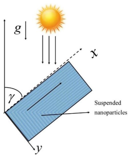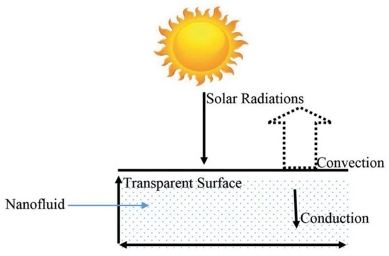 The unsteady mixed convection Poiseuille flow of Casson nanofluid is studied by Aman et al. []. They obtained the semi-exact solutions by the Light–Hill technique. The single-walled carbon nanotubes and multi-walled carbon nanotubes are chosen as nanoparticles in the base fluid. The effects of various parameters on the fluid flow, temperature profile, skin friction, and Nusselt number were discussed in detail. The bottom line is that the velocity of the nanofluid decreases with the increasing values of the volume fraction of carbon nanotubes which means that the nanofluid will become denser when the fraction of the carbon nanotubes is increased. Kataria and Mittal [] have taken into consideration the flow of nanofluid with heat and mass transfer. In this article, they considered the ramped wall temperature and ramped wall concentration on the wall. Besides, they calculated the Nusselt number, Sherwood number, and skin friction on the boundary. They mentioned in their conclusion that the heat transfer increases with increasing values of the volume fraction when ramped wall temperature is taken and decreases in the case of isothermal wall temperature on the boundary. Heat transfer enhancement in the free convection flow of Maxwell nanofluid is considered by Aman et al. []. The exact solutions are obtained for the velocity and temperature profile via the Laplace transform method. The behavior of velocity and temperature profiles of the nanofluid with single-walled carbon nanotubes and multi-walled carbon nanotubes in four different base fluids i.e., Kerosene oil, Engine oil, water, and ethylene glycol have been studied in their paper. Their study has concluded that the velocity increases with the increase in the Grashof number, and the shear stress is decreasing, while there is no motion in the absence of Grashof number. The MHD flow of nanofluid inside a channel is studied by Khan []. He considered the slip condition on the lower boundary of the channel. The analysis of the flow and heat transfer provided for four different shapes of molybdenum disulfide nanoparticles in the base fluid. The fluid was taken to be electrically conducted and passing through porous media. The bottom-line of this research work [] is that the blade and platelet-shaped nanoparticles showed the highest heat transfer rate as compared to the cylinder and brick shapes. The comparative analysis of two different fractional models for nanofluid flow was presented by Sheikh et al. [] in their study. For the generalization of the classical model of nanofluid the concepts of Caputo Fabrizio [] and Atangana Balaenu [], fractional derivatives were used. In their article, the applications of nanofluids in solar collectors were provided (Figure 7).