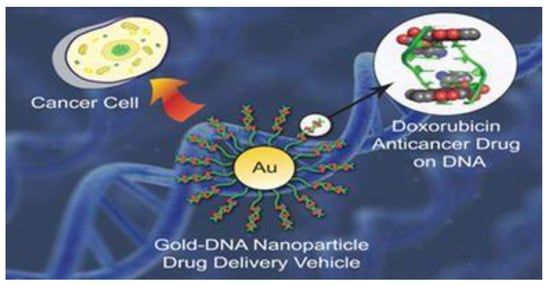 The combined effects of thermal radiation and the magnetic effect on the unsteady flow of Brinkman-type nanofluid is studied by Gohar et al. []. Water, kerosene oil, and engine oil were considered as the base fluids and carbon nanotubes as the nanoparticles. The key finding from this research article is that the velocity of the nanofluid with multi-walled carbon nanotubes is higher as compared to the velocity of the nanofluid with single-walled carbon nanotubes. Moreover, the velocity decreases with the increasing values of the Brinkman-type fluid parameter. The microrotation and microinertia characteristics of nanofluids are discussed by Hussanan et al. []. Like the paper presented by Gohar et al. [], this research article [] also includes water, kerosene oil, and engine oil as the base fluid, and five different nanoparticles (copper oxide, titanium oxide, alumina oxide, iron oxide, and graphene oxide) were considered. The main outcome of this research is that the temperature of micropolar fluid with suspended nanoparticles of graphene oxide is higher than the nanofluid with other nanoparticles. The mixed convection Poiseuille flow of a Casson nanofluid is studied by Aman et al. []. Three different base fluids with carbon nanotubes as suspended nanoparticles were chosen to analyze the flow. The finding of their research work is that the temperature is higher for single-walled carbon nanotubes as compared to the multi-walled carbon nanotubes. Moreover, the velocity of the nanofluid decreases with the increase in the volume fraction of the nanoparticles. The convective flow of a carboxy–methyl–cellulose fluid with carbon nanotubes is studied by Saqib et al. [] in their research article. The fluid is considered electrically conducted and passing through a porous media. They transformed the classical model of the nanofluid to the Atangana–Baleanu fractional model and then solved it by using the Laplace transform technique. The results show that multi-walled carbon nanotubes are more efficient in the base fluid as compared to the single-walled carbon nanotubes. The unsteady free convection flow of polyethylene glycol–based nanofluid was carried out by Ali et al. []. They considered polyethylene glycol as a base fluid and molybdenum disulfide as the suspended nanoparticles. Moreover, they considered the ramped wall temperature and isothermal temperature on the wall. The problem was modeled in terms of partial differential equations and then solved by the Laplace transform technique. From the results, the velocity, temperature, and concentration were higher for the isothermal wall temperature and lower for the ramped wall temperature. The effects of thermal radiation, thermal diffusion, and chemical reaction on the MHD mixed convection Poiseuille flow of nanofluid passing through a porous medium was taken into consideration by Aman et al. []. Five different types of nanoparticles were suspended in the base fluid, and their comparison was presented in graphs. In their paper, they concluded that nanofluids with metal nanoparticles have a high heat transfer rate as compared to the nanofluids with metal oxide nanoparticles. The applications of gold nanoparticles were discussed for cancer therapy (Figure 9).