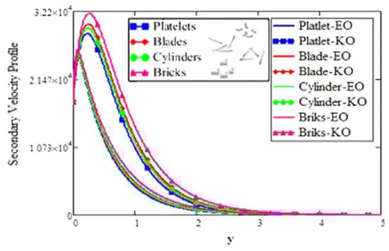 Aman et al. studied the heat and mass transfer effects on the MHD flow of nanofluid with graphene oxide nanoparticles []. They considered the base fluid as a working fluid in the solar collectors. The model was generalized by using the Caputo fractional derivative approach and then solved by the Laplace transform technique. The solutions are presented in terms of the Wright function []. They noted that the heat transfer rate of the nanofluid increased with the increasing values of the volume fraction of the nanoparticles and the Caputo fractional parameter. In another paper, Aman et al. [] presented the idea of hybrid nanofluid. They considered the Casson nanofluid with hybrid nanoparticles, i.e., alumina and copper nanoparticles. The problem is modeled in terms of the fractional differential equations using the definition of Caputo fractional derivatives. The fractional model is then solved by the Laplace transform technique, and the exact solutions are obtained. In this paper, they missed the plot for the velocity profile, which would show the effect of the volume fraction of the nanoparticles on the fluid velocity. The unsteady flow of water-based nanofluid with carbon nanotubes as suspended nanoparticles is discussed by Khan et al. []. Newtonian heating on the wall of the channel is taken into account, and the model is generalized using the modern concept of Atangana–Baleanu fractional derivatives []. The fractional model is solved by using the Laplace transform technique and the Laplace inversion is presented using Tzou’s and Stehfest’s algorithms []. It is concluded that the temperature distribution is increased by increasing the volume fraction of the nanoparticles. The unsteady MHD flow of diathermic oils with heat transfer is studied by Ali et al. []. The Brinkman-type fluid model is considered in their research article. Engine oil and kerosene oils were chosen as base fluids and molybdenum disulfide nanoparticles were taken in different shapes (Table 6 and Figure 12).