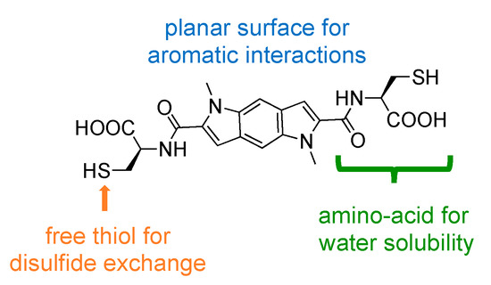 The pyrrolo[2,3-f]indole scaffold consists of a pyrrole ring condensed with the benzene ring of an indole. This is the so-called “type I pyrroloindole” found in many natural alkaloids and also widely used in medicinal chemistry research [53,54]. It is aromatic (14 π electrons) and bears cysteine appendages on the α, α’ positions that confer it water solubility and ability to be involved in disulfide exchange (Figure 1).
