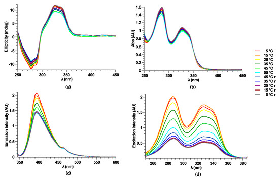 Thermal and photodegradation studies of 9 in chloroform at the specified temperatures (r denotes return temperature ramp) in the legend: (a) variable temperature (VT) circular dichroism (CD) spectra (5 × 10−5 M); (b) VT absorption spectra (5 × 10−5 M); (c) VT emission spectra (2.5 × 10−6 M); (d) VT excitation spectra (2.5 × 10−6 M). The sample concentration used in each experiment is given in brackets. The same color code is used for each graph.