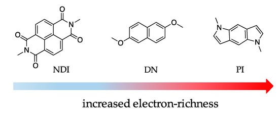 General structures of two main building blocks for dynamic combinatorial chemistry (DCC) and the new one designed in this work arranged in order of increased electron-richness.