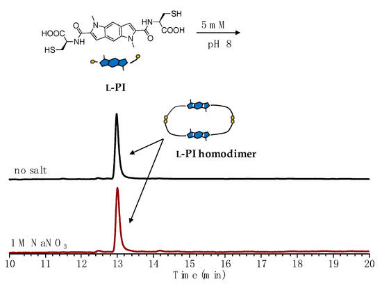 One of the driving forces behind DCLs in aqueous systems is the hydrophobic effect [58]. This refers to reorganization of water molecules around a hydrophobic unit formed within the system. The hydrophobic effect is generally enhanced by adding inorganic salts [15]. Previous work in the field shows that changing either the cation (Li+, Na+, K+ and Cs+) or anion (NO3−, SO42−, Br− and Cl−) has led to similar DCLs distribution, which is due to an increasing in medium polarity with minimum template contribution [15,45]. DCLs of l-PI with and without 1 M NaNO3 (added to enhance the hydrophobic effect) were prepared according to the method described in Section 2. Once equilibrated, the libraries have been analyzed by HPLC, MS and MS/MS; the chromatograms are shown in Figure 4 (cartoon representations are used for clarity). The distribution of both libraries shows one major species identified as l-PI homodimer by MS and MS/MS analyzes (Figures S15–S17).