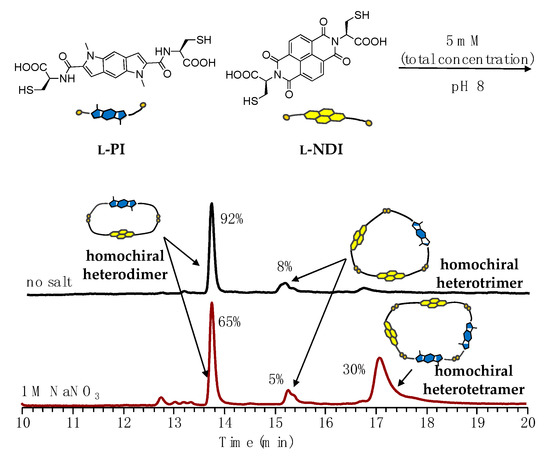 Quadrupole moment calculations for the pyrroloindole core have identified it as a more electron-rich aromatic than DN (−22.7 B vs. −15.1 B). Homo- and heterochiral DCLs of l-PI and l- and d-NDIs have showed similar library distributions: homo- and heterodimers. The increase of ionic strength in the system by adding NaNO3 has led to the formation of tetramers besides dimers.