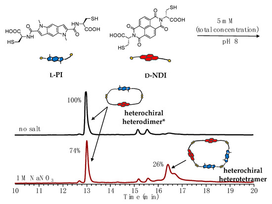 The chirality influence on the library distribution was explored by setting up heterochiral DCLs. The D enantiomer of NDI [59] was synthesised using the reported microwave-assisted method for l-NDI [60,61]. The l-PI:d-NDI mixture mainly leads to the heterochiral heterodimer when no salt is present (Figure 6). The addition of salt changes the library distribution in a similar trend to that of the homochiral DCL with NaNO3: a heterochiral heterotetramer is formed (all MS and MS/MS spectra are provided in Figures S28–S32). The 1:1 molar ratio PI:NDI system does not show any chiral recognition, producing similar outcomes regardless of whether homo- or heterochiral mixture of building blocks is used. Literature reports just one example of homo- and heterochiral DCLs based on disulfide exchange, but no chiral recognition is observed either [13].