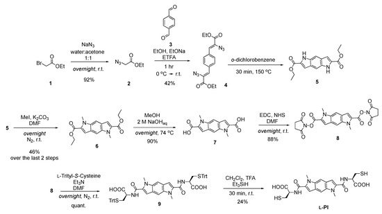 The synthetic protocol was then optimised (Scheme 2) and the Hemetsberger step carried out in more diluted conditions to prevent polymerization. Pyrrole chemistry shows that the free -NH units lead to extensive polymerization [56]. Thus, the -NH groups were alkylated, which allowed the synthesis of pure pyrroloindole 6. The next steps included hydrolysis of the ester group to give 7, followed by NHS activation, and S-trityl-L-cysteine attachment and deprotection via previously reported methods [45]. The final building block l-PI was obtained in 8 steps, none of which required laborious purification (experimental details in Supplementary Materials Section 1).
