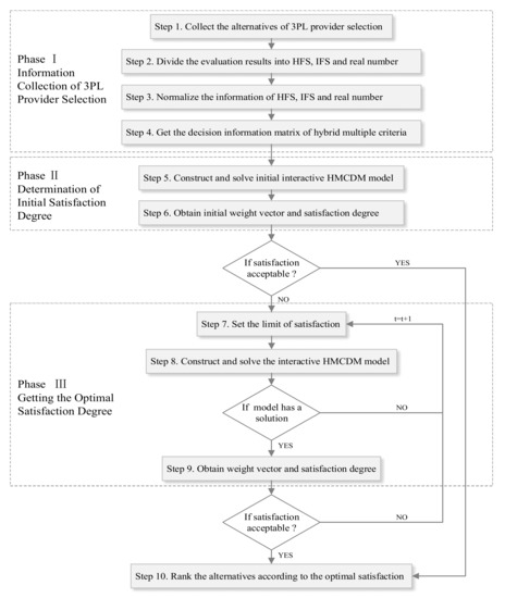 Based on the above interactive HMCDM method, the process of 3PL provider selection can be divided into three phases. In phase I, it aims to collect and normalize the information of 3PL provider selection. Based on the decision matrix of hybrid multi-criteria in phase I, an initial interactive HMCDM model is constructed and used to obtain the initial satisfaction degree of DMs for the alternatives in phase II. The goal in phase III is to obtain the optimal weight vector and satisfaction degree by solving the interactive HMCDM models. The steps of the proposed interactive HMCDM method are shown in Figure 1.