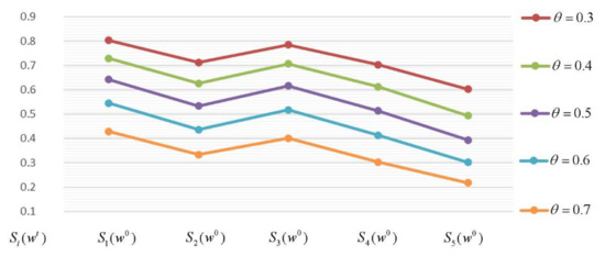 It can be seen from Table 3 that although the initial satisfaction degree is different for within a range of 0.3–0.7, the ranking orders of five 3PL providers according to the satisfaction degree are the same; that is, . It can also be seen that the smaller the value of , the higher the satisfaction , and that the two values show the opposite trend. Figure 2 shows that a change in parameter does not affect the rank of the alternatives.