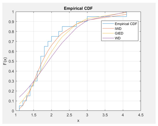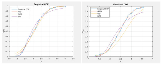 Here, the fitting of three reliability models based on GIED (as shown in Example 1), WD (as shown in Section 2.3), IWD (as shown in Example 2) is considered. We use maximum likelihood estimation to construct the above three parametric models. Same as in Section 2.3, for each model, five measures are considered to test the goodness-of-fit: (1) −ln, (2) distance, (3) p-value, (4) , and (5) . In the case of MLE, these values based on the three reliability models are listed in Table 7. Clearly, the best fit order for both datasets is: