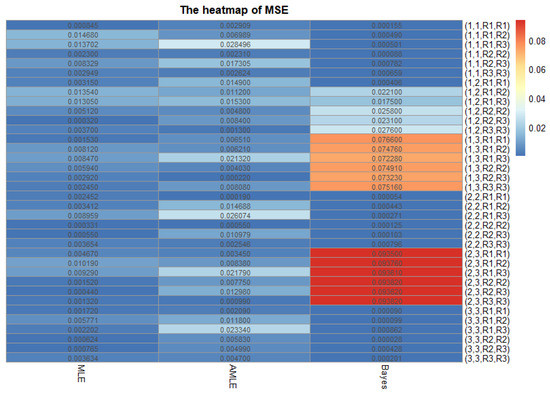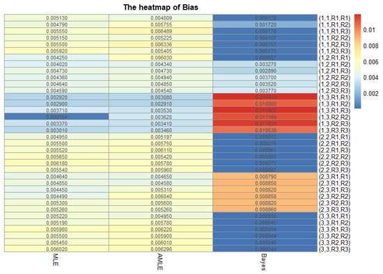 From Table 5, all the point estimates are quite effective as the corresponding MSEs and biases are pretty small. Additionally, we speculate from Figure 2 and Figure 3 that the accuracy of the estimators is somewhat related to the true value of because the MSEs and biases of the Bayesian estimator show a great difference between the case of and the others. We can find in the cases that takes and , the MSEs and biases of the Bayesian estimator are much higher than those in the other cases. However, in the cases of , Bayes estimates are extremely accurate.