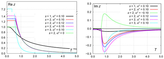 Figure 1. Fugacity for different values of s and α (with the real part fixed as α = 0.1 ). (left) Real part z = Re z . (right) Imaginary part z = Im z .