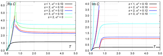 Figure 2. Specific heat for different values of s and α (with the real part fixed as α = 0.1 ). (left) Real part C = Re C . (right) Imaginary part C = Im C .