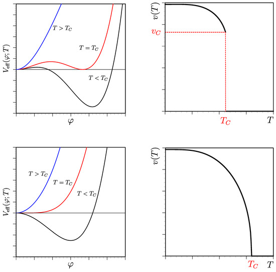 In Figure 1, first- and second-order phase transitions are depicted in upper and lower panels, respectively. In the left panels, the effective potentials are plotted as functions of while the temperature evolutions of the scalar VEV are shown in the right panels. In the first-order phase transition case, there exists discontinuity in the evolution of the vacuum and the critical temperature () is defined at a temperature at which has the degenerate minima separated by the potential barrier as shown in the upper left panel. is the VEV at , where T approaches from below. What is important here is that the bosonic thermal loop contribution has the cubic term with a negative sign, (Here we assume that such as gauge bosons or scalars in classical scale-invariant theories. In general, however, can have an extra mass parameter, for instance in the theory, , which will be discussed below) originated from the zero Matsubara frequency mode , which can induce the potential barrier. In the second-order phase transition case, on the other hand, the temperature evolution of VEV is continuous but its first derivative with respect to the temperature has the singular behavior at which is defined by the temperature at which the curvature at the origin becomes zero. Unlike the first-order phase transition, there is no potential barrier.