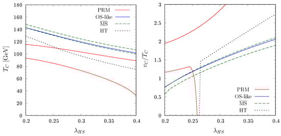 where (const) denotes the -independent terms. This resummed potential agrees with that in the Parwani scheme Equation (25) except for the last term. Comparisons between the two resummation schemes in a model of the SM extension can be found in Ref. [75] (for a recent study, see, e.g., Ref. [119]).