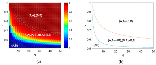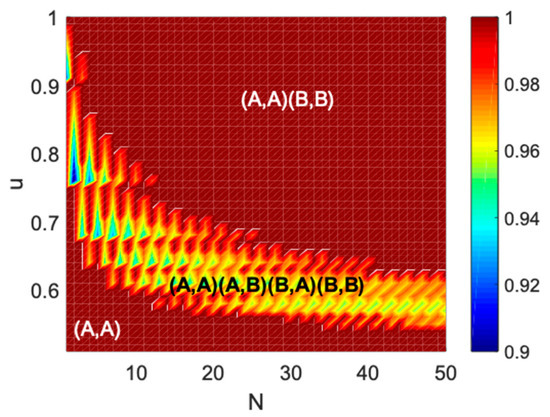 In Figure 1, (a) shows the probability that the population is in coordination or under the combination of different parameters and . Figure 1b shows the final evolutionarily stable state of the strategy updating process in the region with different parameter combinations.