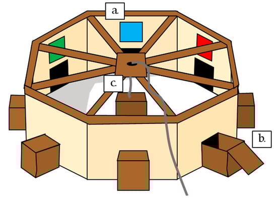 The arena consisted of a large octagon, approximately 2.6 m in diameter, 0.75 m high, with opaque sides to restrict the view of the surrounding landscape, but a mesh top through which the sky and therefore movement of the sun could be clearly seen. The arena was placed in the middle of a field, so no identifiable landmarks could be seen from within the arena. In the middle of each of the eight sides, a 25 × 25 cm square hole gave access to a wooden box, which could contain a food reward. This box had a wooden block in the centre, behind which the food reward could be concealed. Above each box entrance on the arena wall was a coloured beacon, 25 × 25 cm (green, black, barred white, yellow, barred blue, grey, red, and blue). In the centre of the arena was a central supporting pole, with a release box. Birds were placed under this box in the centre of the arena, then released at a distance by the experimenter, via a rope used to lift the box (Figure 1).