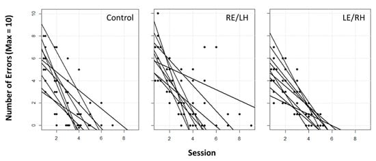 Rates of task learning across the three experimental groups, measured as the number of errors per session (n = 10 trials per session) against session number. Each point represents an individual bird’s performance in that session, and each line signifies the regression slope for each individual bird.