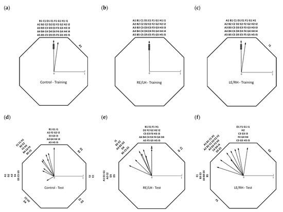 The Hotelling’s test for paired data revealed a significant difference between the training and test orientation in all three experimental groups (paired sample Hotelling’s test: C F1,16 = 16.03412, P < 0.01; RE/LH F1,16 = 4.833955, P < 0.05; LE/RH F1,16 = 8.61383, P < 0.025), showing that the conflict of cues produced a change in orientation in the three groups of birds (see also Table 1).