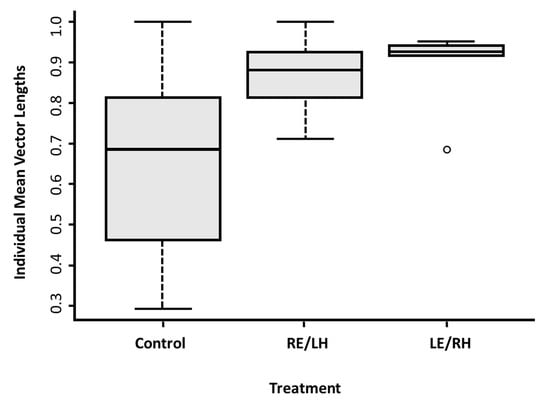 Box and whisker plot of the mean vector lengths for the directional choices of each individual bird across the five test trials, grouped by experimental treatment (see Figure 3d–f for individual mean vector visualisation).