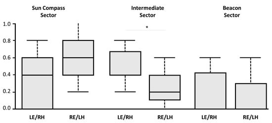 The direct comparison between the two monocular groups on the rate of choices displayed for the three relevant sectors of the arena (training direction sector as defined by the sun compass, training beacon sector and sector in between) showed that rate of choices for the sector in between the two cues set in conflict (training sun compass direction sector and training beacon) was significantly higher for the LE/RH pigeons compared to the RE/LH (Mann–Whitney U test P < 0.05; see Figure 5). However, no significant difference was found in the rate of choices for either the training sector identified by the sun compass (Mann–Whitney U test: u = 23.5, P > 0.05) direction or the sector identified by the training beacon (Mann–Whitney U test: u = 39, P > 0.05).