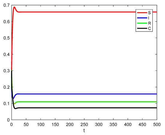 Let direct calculation shows it follows from Theorem 2, the disease will go to extinction eventually (see Figure 2).