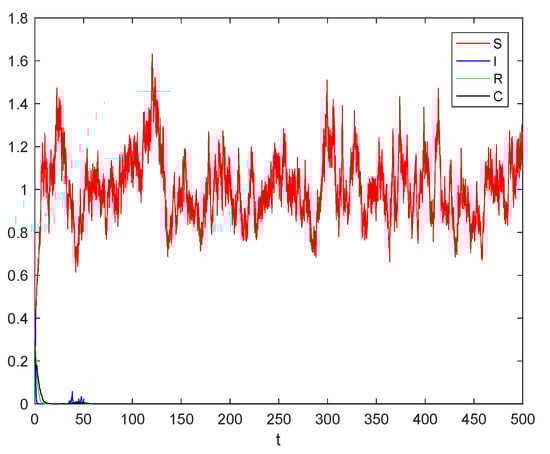 However, there are stochastic factors everywhere in nature, so it makes sense to study biological models with stochastic factors because random factors provide one more dimension, for example, Zhu et al. [], Zhang and Zhang [], Liu et al. [] and Chi and Zhao [] have considered stochastic effect on population. In particular, infectious diseases are inevitably affected by stochastic factors during the process of transmission. Compared with deterministic epidemic models, stochastic epidemic models can better reflect the evolution of infectious diseases in nature. According to the way of considering different stochastic disturbances, many scholars have established a variety of stochastic infectious disease models, and investigated the asymptotic behavior of the system. For example, the impact of environmental disturbances on the rate of transmission have been considered based on SIR (Susceptible-Infected-Recovered) [,,,,,,], SIS (Susceptible-Infected-Susceptible) [,,,,,] and SIRS (Susceptible-Infected-Recovered-Susceptible) model [,,,]. However, the above literatures on infectious diseases have evolved mainly among the three compartments (S, I and R). According to the study in [], cross-immunity causes complex transmission of infectious diseases. Then based on model (1), we consider the impact of environmental disturbances on SIRC model and get a stochastic SIRC model as follows: