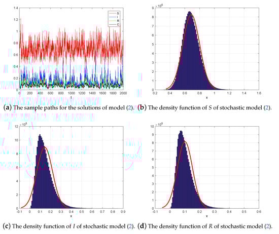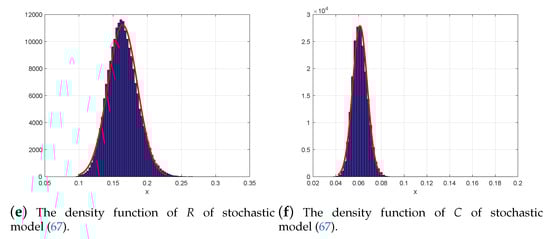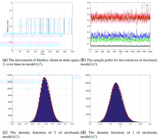 In model (67), let Simple calculation shows by Theorem 4, model (67) has a stationary distribution. In Figure 4, Figure 4a shows Markov chain and Figure 4b shows the sample paths for the solutions of stochastic SIRC model (19). Figure 4c–f show the probability density functions of , , and respectively, and the filled contour is sample distribution and the drawn line is density function.