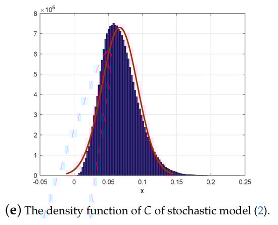 If we let then we obtain according to Theorem 3, the model (2) has a unique stationary distribution, Figure 3b–e depict the probability density of the variables and respectively, the filled contour is sample distribution and the drawn line is density function. Figure 3a is the corresponding sample paths.
