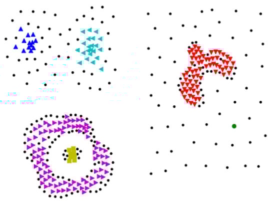 - Ester, M.; Kriegel, H.P.; Sander, J.; Xu, X. A Density-Based Algorithm for Discovering Clusters in Large Spatial Databases with Noise. In Proceedings of the 2nd International Conference on Knowledge Discovery and Data Mining, Portland, OR, USA, 2–4 August 1996; pp. 226–231. [Google Scholar]