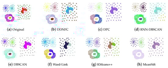 In order to verify the effectiveness of DDNFC, we compare it with another six algorithms, DPC, RNN-DBSCAN [21], DBSCAN, KMeans [2], Ward-link and Meanshift [4], on artificial and real data sets. By using three cluster validity indexes [1,22,23], F-measure with (F1), adjusted mutual information (AMI) and adjusted rand index (ARI), we evaluate and discuss the performances of these seven methods. All algorithms are implemented in Python Integrated Development Environments (version 3.7). DPC and RNN-DBSCAN are coded according to the original articles respectively. Other five methods we use are the built-in algorithms or models provided by scikit-learn library [24]. The ways of parameter setting of the algorithms are described as follows: (1) Meanshift uses the default parameters of the model in scikit-learn; (2) The input parameters of KMeans and Ward-Link are all set to the true number of clusters. KMeans adopts KMeans++ to initialize the centers of clusters; (3) To get the best result of DBSCAN, we use the grid-searching method to find the optimal values for the two parameters, and . The value of varies in the range of 0.1−0.5 and the interval is 0.1. While the ranges from 5 to 30 and steps 5. (4) The cutoff distance required by DPC is calculated by the input percentage value. In this paper, the optimal parameter value is searched from 1.0 to 5.0 percentages in steps of 0.5. In order to simplify the implementation of DPC, we select c points with the top values of , which defined as in [18], directly as the cluster centers. In addition, the density of DPC is calculated by Gauss kernel. (5) The optimal values of parameter k of our method and RNN-DBSCAN are set in the range of .