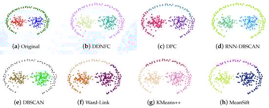 Flame has two classes with similar densities but different shapes, and they are very close to each other. As the results shown in Figure A2 and Table 2, the algorithms based on density can find out two clusters more accurately, except for some classification errors in the adjacent parts between the two clusters. DDNFC got the completely correct result; DBSCAN treated two outliers in the upper left corner as noise. Obviously, in this data set, the algorithm based on density is obviously superior to the other three clustering algorithms.