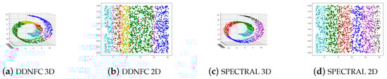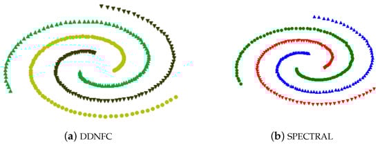 On Spiral, the k of DDNFC was set to 4, and the two parameters of spectral clustering were 3 and 4 respectively, and the results shown in Figure 5 are all entirely correct.