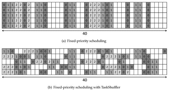 To make such an attack scenario feasible, the attacker should monitor the execution pattern of the target system for a long time to catch the proper timing to launch the attack. Because the same execution pattern of real-time systems is (mostly) repeated, the success ratio of the attack would increase. Figure 2 presents the scheduling pattern of scheduled by a fixed-priority scheduling ( and have the highest and lowest priorities, respectively) without (Figure 2a) and with (Figure 2b) TaskShuffler on a uniprocessor platform. It shows which task executes in 200 time slots, and the number in each rectangle presents the task index executed at the time slot. As shown in Figure 2a, the scheduling pattern is repeated every 40 time units because the least common multiple of periods of tasks in is 40. On the other hand, the scheduling pattern is obfuscated by TaskShuffler (most importantly) without schedulability loss (Figure 2b). That is, every task both in Figure 2a,b completes its execution without any deadline miss. It implies that TaskShuffler could improve potential durability against timing-inference attacks by obfuscating the scheduling pattern of real-time systems without schedulability loss.