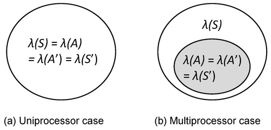 Let be the set of schedulable task sets scheduled by FP scheduling, and be the set of task sets each of whose schedulability is guaranteed by a given schedulability analysis supporting FP scheduling. In addition, denotes the set of schedulable task sets scheduled by FP scheduling incorporating TaskShuffler, and is the set of task sets each of whose schedulability is guaranteed by a given schedulability analysis supporting FP scheduling incorporating TaskShuffler. Figure 3a shows the regions of task sets covered by , , , and for uniprocessor platforms. in Figure 3a indicates a well-known fact that every schedulable task set ’s schedulability is guaranteed by the given exact schedulability analysis (e.g., RTA supporting FP scheduling) [13]. Then, the TaskShuffler targets task sets belonging to () and applies the TaskShuffler protocol; note that task sets out of has nothing to do with the goal G. It utilizes a specialized schedulability analysis to support the FP scheduling incorporating the TaskShuffler protocol. When is conducted for each task , the lower-bound amount of priority inversion for each task is calculated, and the TaskShuffler exploits it without compromising the schedulability of task sets . Therefore, it achieves as shown in Figure 3a.