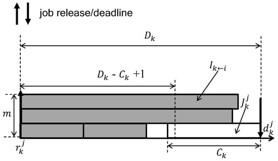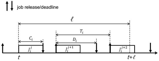 To upper bound , we use the concept of workload of a task in an interval of length ℓ, which is defined as the maximum amount of time units required for all jobs released from in the interval of length ℓ. As shown in Figure 4, the left-most job (called the carry-in job) of starts its execution at t (i.e., the beginning of the interval) and finishes it at . That is, it executes for without any delay. Thereafter, the following jobs are released and executed without any delay. By calculating the number of jobs executing for and the other jobs executing for a part of , the workload of in an interval of length ℓ (i.e., ) is calculated by [18].