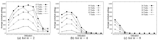 We randomly generated even task sets from nine system utilization groups, for , that is, 100 instances per group. The system utilization of a task set is defined as the sum of the utilizations of all tasks () in the task sets. We considered three different numbers of processors and 8. Each system utilization group has five sub-groups, each of which has a fixed number of tasks; for and 8, the number of tasks for five sub-groups are {}, {} and {}. Each task period was randomly selected from {20, 40, 80, 160, 320, 640, 1280, 2560}, and each WCET was selected from . A total of 100 task sets were generated for each sub-group, and thus task sets were generated in total. As our goal is to improve the uncertainty of the schedule without compromising schedulability, we only selected the task sets whose schedulability is guaranteed by DA schedulability. We used rate-monotonic (RM) scheduling as our base scheduling algorithm in which our proposed schedule randomization was applied. To obtain the converged schedule entropy of each task set, we conducted a simulation for 10,000 hyper-periods of the task set as it ensures less than 0.01% (recommended to obtain the converged schedule entropy [15]) of difference in schedule entropy between those from 9999 and 10,000 hyper-periods.