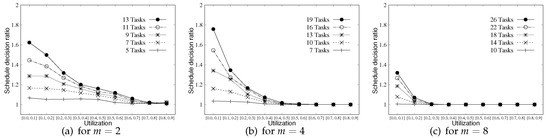 From Figure 6a–c, we can observe that the average schedule entropy of task sets decreases as the number of processors m increases. This is mainly due to the underlying pessimism of the DA schedulability analysis in calculating in Equation (4). As Figure 5 implies, the DA schedulability analysis assumes that the execution corresponding to is performed as much as possible in the interval [, ) to upper bound . However, this does not happen in most cases since two jobs released consecutively from the same task may execute at intervals from each other, which implies that the amount of execution contributing to is overestimated under the DA schedulability analysis. Such pessimism of the DA schedulability analysis increases for a larger value of m. As our schedule randomization protocol is based on the DA schedulability analysis to derive , task sets with a lower value of (from a larger value of m) results in a lower average schedule entropy.