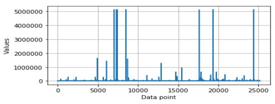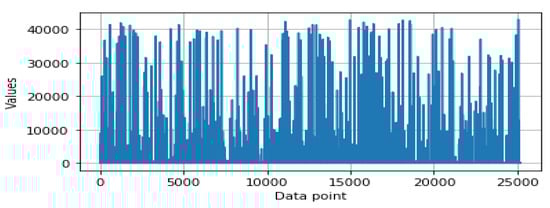 - Feature scaling: In data pre-processing, feature scaling is also known as data normalization. The values of the security features are in different ranges that vary from feature to feature. For instance, Figure 1 and Figure 2 show the data distributions of two different features, and , respectively. For some data points, the value is very low while for some data points, it is much higher, as shown in Figure 1 and Figure 2. Thus, data scaling method is used to normalize the range of the feature values, known as the independent variables as well. In order to do this, we used a Standard Scaler that normalizes the security features with the mean value = 0 and standard deviation = 1. The normalized values are then ready for further analysis in order to build the security model.